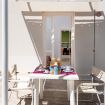 Spazio esterno zona living e zona camera da letto matrimoniale attrezzato con tavolo e sedie.