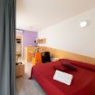 Letto in “living area” con letto doppio/matrimoniale, Televisore Flat-screen. Bagno con finestra, ampia e moderna doccia, bidet ed ampio tavolo con lavandino, asciugacapelli e linea di cortesia.