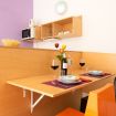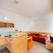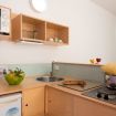 Soggiorno con cucina, Linea elettrodomestici con piano ad induzione, forno a microonde, frigorifero, bollitore elettrico, macchina espresso, utensili e servizio da tavolo.